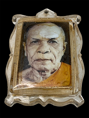 ล็อกเก็ตรูปหลวงพ่อสด วัดปากน้ำ ด้านหน้าตอกโค๊ต หลังฝังล็อคเก็ต จีวรและยันต์ |