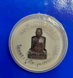 พระกริ่งหลวงพ่อแช่มวัดฉลอง รุ่นแขนทลุ เนื้อทองเหลือง ปี 2541 จังหวัดภูเก็ต พร้อมกล่องเดิมจากวัด