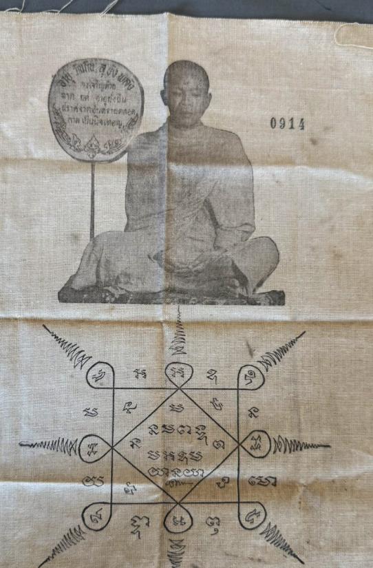 ผ้ายันต์ หลวงพ่อคูณ ปริสุทโธ วัดบ้านไร่ จ.นครราชสีมา หมายเลข 0914 ปี 2517