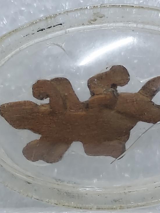 รายละเอียด จิ้งจก หลวงปู่หน่าย ตัวเล็ก จากหัวถึงปลายหางประมาณ 2 ซม.ครึ่ง มีรอยจารเก่าด้านล่างตรงท้อง รอยจารอักขระเรียง