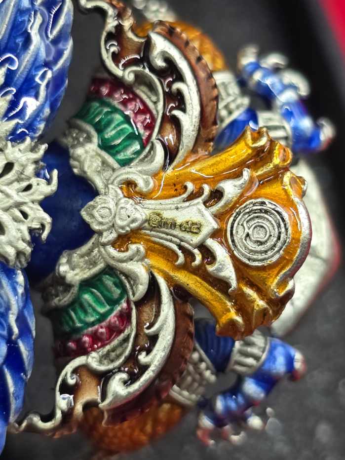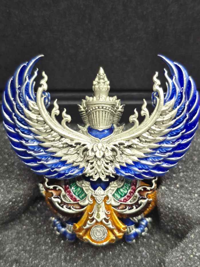 พญาครุฑ รุ่นมีโชคพันล้าน หลวงพ่อโชคชัย วัดน้ำดิบ เนื้อมหาชนวนชุบเงินซาตินกายน้ำเงิน แยกชุดกรรมการ หมายเลข 74 พร้อมกล่องเดิม |