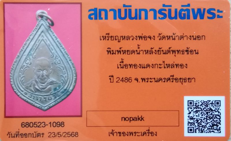 เหรียญหลวงพ่อจง วัดหน้าต่างนอกพิมพ์หยดน้ำหลังยันต์พุฒซ้อน เนื้อทองแดงกะไหล่ทอง ปี2486 จังหวัดพระนครศรีอยุธยา มาพร้อมบัตรรับรองค่ะ