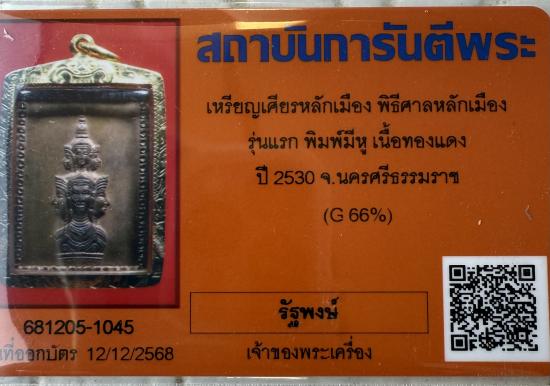 เริ่มแดงที่ราคาเบาๆครับ เหรียญเศียรหลักเมือง รุ่นแรกปี2530 นครศรีธรรมราช หรืออีกชื่อเหรียญแสตมป์ พิมพ์มีหู เนื้อทองแดง พร้อมกรอบทอง66% พร้อมบัตรการันตีครับ ผิวไฟแดงๆครับ