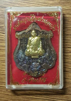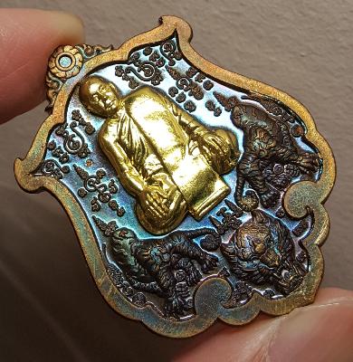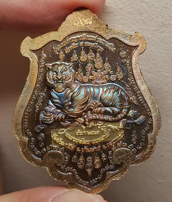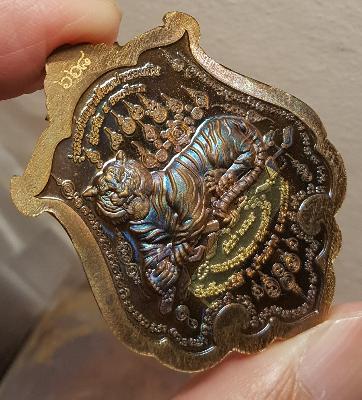 เหรียญมนต์พญาเสือเฒ่านอนกิน เนื้อสัตตะโลหะ หน้ากากปลอกลูกปืน หลังฝังตะกรุด หมายเลข 668 หลวงพ่อไฉน วัดสังฆปรีดี ผิวรุ้งสวยๆ พร้อมกล่องเดิม
