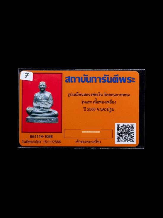 รูปเหมือนหลวงพ่อเงิน วัดดอนยายหอม รุ่นแรก เนื้อทองเหลือง ปี 2500 สวยเดิม พร้อมบัตรรับรอง