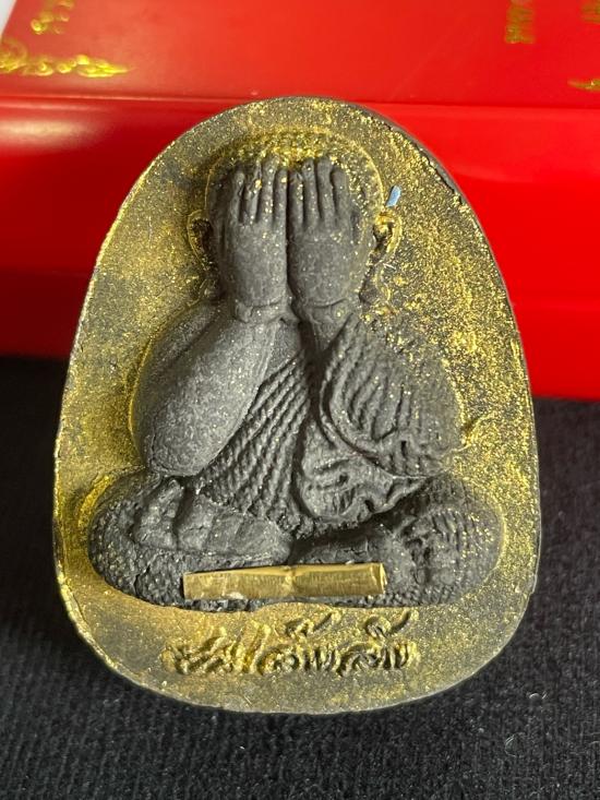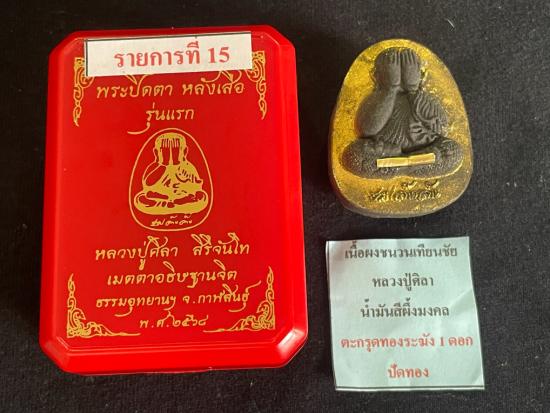 พระปิดตา หลังเสือรุ่นแรก หลวงปู่ศิลา สิริจันโท พิมพ์ใหญ่ เนื้อผงชนวนเทียนชัย น้ำมันสีผึ้งมงคล ตะกรุดทองระฆัง 1 ดอก ปัดทอง หมายเลข 202 พร้อมกล่อง