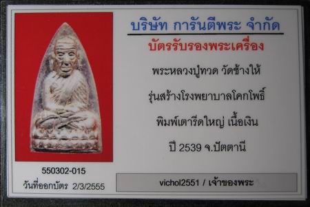 หลวงปู่ทวด รุ่นสร้างโรงพยาบาลโคกโพธิ์ พิมพ์ใหญ่ (เนื้อเงินแท้) ปี 2539 พร้อมบัตรรับรอง