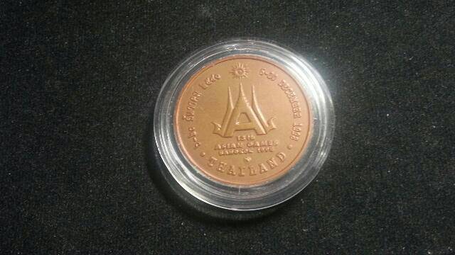 เหรียญที่ระลึกการเเข่งขันกีฬาเอเชี่ยนเกมส์ ครั้งที่ 13 พ.ศ 2541 พระเจ้าอยุ่หัวทรงเรือใบไมโครมด เนื้อทองแดง สภาพสวยตลับเดิม