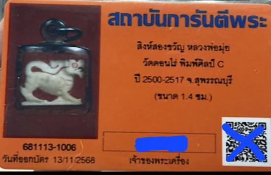 สิงห์สองขวัญ หลวงพ่อมุ่ย วัดดอนไร่ ปี2500-2517 ไซค์ขนาด 1.4 ซม. เลี่ยมเก่าพร้อมบัตรการันตรี