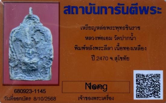 เหรียญหล่อพระพุทธชินราช หลวงพ่อเอม วัดปากน้ำ เนื้อทองเหลือง ปี 2470 จ.สุโขทัย + บัตร G Pra ครับ