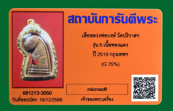 ชื่อพระเครื่อง วัดใจ เสือหลวงพ่อวงษ์ วัดปริวาสฯ รุ่น 6 ปี 2519 เนื้อทองแดง (บล็อคหูจุด) เลี่ยมทองคำแท้ สวยเดิมๆ คมชัด ไม่ผ่านการใช้ มีบัตรรับรอง