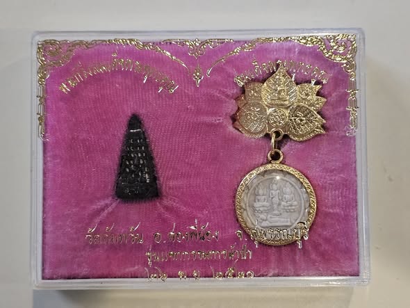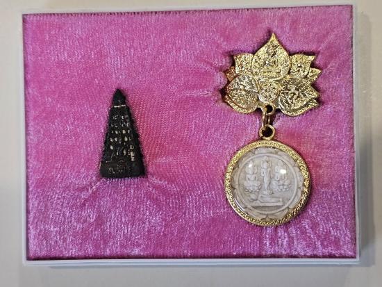 พระผงสมเด็จพุทธคุณ สังเวชนีย์ ๔ (สมเด็จพุทธคุณ) + พระกริ่ง พุทธคุณ สังเวชนีย์ ๔ วัดราชนัดดาราม ปี ๒๕๒๐ และชุดประธานที่ระลึกผ้าป่าวัดอัมพวันจังหวัดสุพรรณบุรี