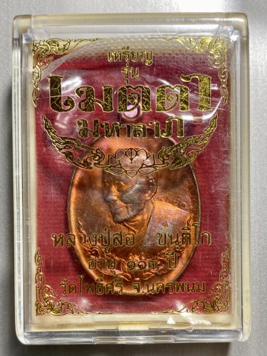 เหรียญเมตตา หลวงปู่สอ ขนติโก วัดโพธิ์ศรี จ.นครพนม เนื้อทองแดงผิวไฟ ตอกโค้ดและรันนัมเบอร์ทุกเหรียญ ปี2651 สภาพสวยกล่องเดิมชีลเดิมๆไม่เคยแกะครับ |