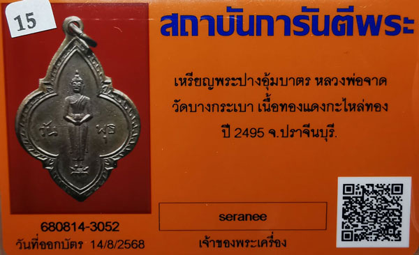 (วันพุธ)เหรียญพระปางอุ้มบาตร หลวงพ่อจาด วัดบางกระเบา เนื้อทองแดงกะไหล่ทอง ห่วงเดิม ปี2495 จ.ปราจีนบุรี + บัตรG-pra สภาพเดิมค่ะ