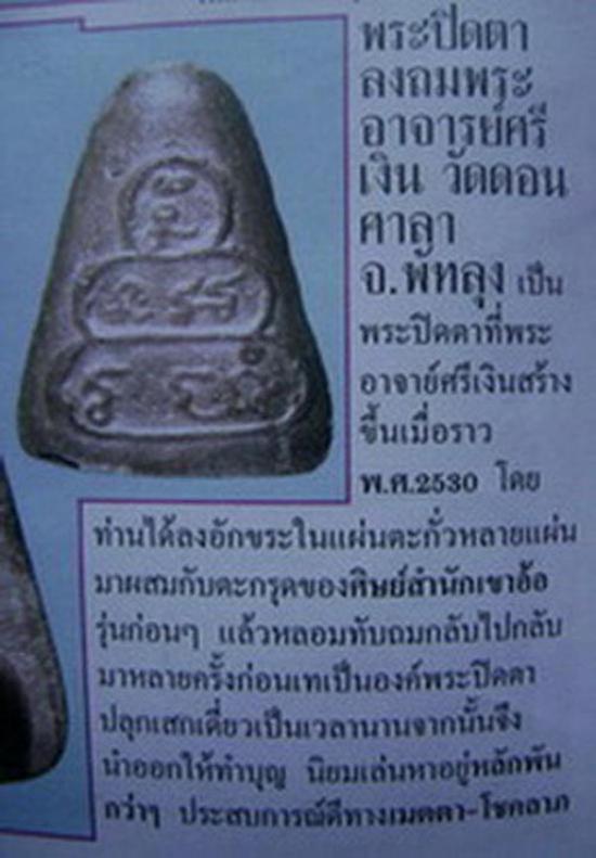 เป็นพระปิดตาอีกรุ่นที่น่าใช้ อ.ศรเงินท่านได้นำแผ่นตะกั่วมาทำการลงอักขระเลขยันต์ตามตำราโบราณเขาอ้อ แล้วจึงนำมาหลอม จากนั้นจึงนำมาแผ่เป็นแผ่น แล้วลงจารอักขระซ้ำๆ จนท่านอาจารย์พอใจว่าใช้ได้แล้ว จึงนำมาหลอมกับฉนวนกระกรุดเก่าของพระอาจารย์รุ่นก่อนๆ แล้วจึงเทเบ้าหลอมออกเป็นเป็นพระปิดตา
