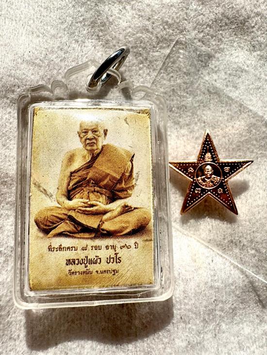 รูปถ่ายซีเปีย หลวงปู่แผ้ว วัดรางหมัน ที่ระลึกครบ๘รอบ อายุ๙๖ปี หลังพระปิดตา จีวร + เหรียญดาวพญาครุฑ