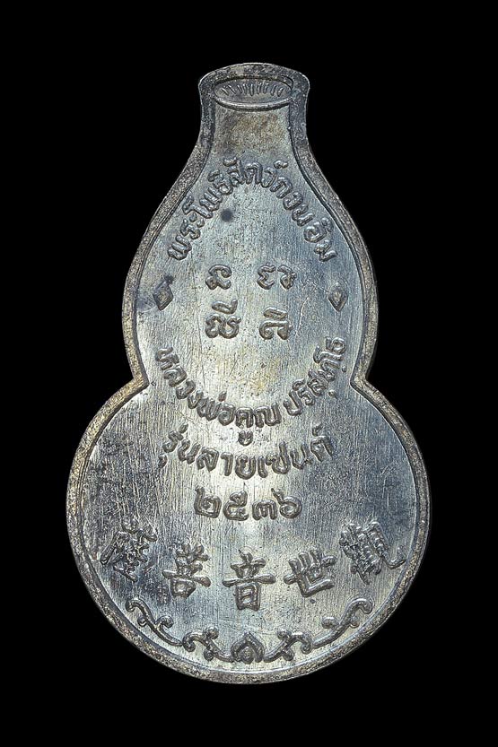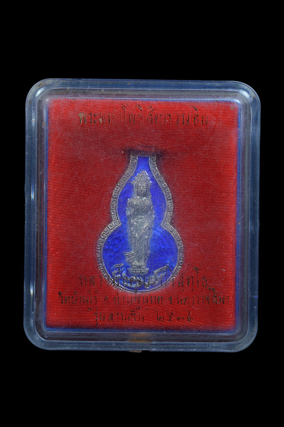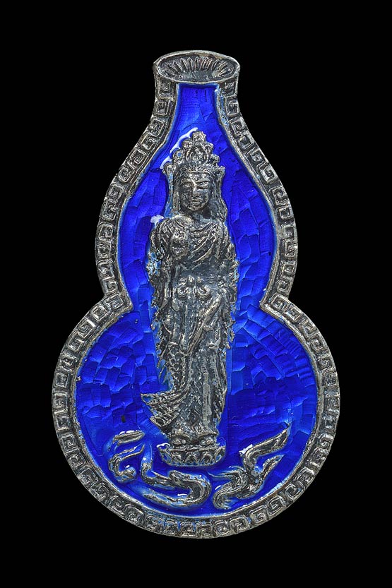 เหรียญน้ำเต้าพระมหาโพธิสัตกวนอิม รุ่น ลายเซ็น ( เนื้อเงินลงยาน้ำเงิน ) พ.ศ.2536 ( กล่องเดิม )