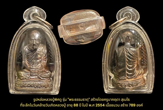 รูปหล่อหลวงปู่พิศดู รุ่น "พระธรรมธาตุ" สร้างโดยครูบากฤดา สุเมโธ เพื่อบูชาธรรมองค์หลวงปู่พิศดู และเป็นที่ระลึกในวันคล้ายวันเกิดหลวงปู่ อายุ 88 ปี ในปี 2554 เนื้อชนวน สร้าง 789 องค์