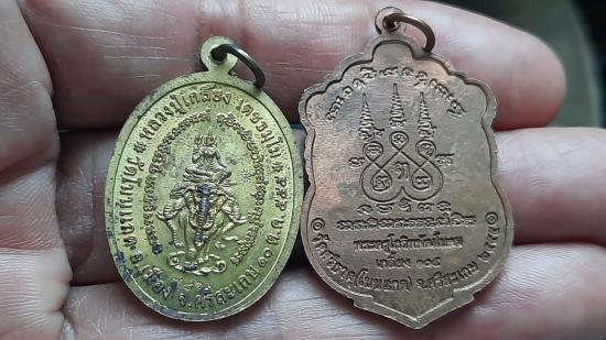 เหรียญหลังเทวดาทรงช้างสามเศียร หลวงปู่เกลี้ยง วัดโนนแกด จ.ศรีสะเกษ รุ่นเจริญพรยอดฉัตร เนื้อทองฝาบาตร หมายเลข782 ปี55++++เหรียญ เสมามหาเศรษฐี 105 ปี หลวงปู่เกลี้ยง วัดโนนแกด เนื้อทองแดง ปี55 (รวม2องค์)