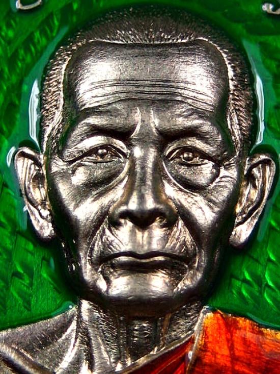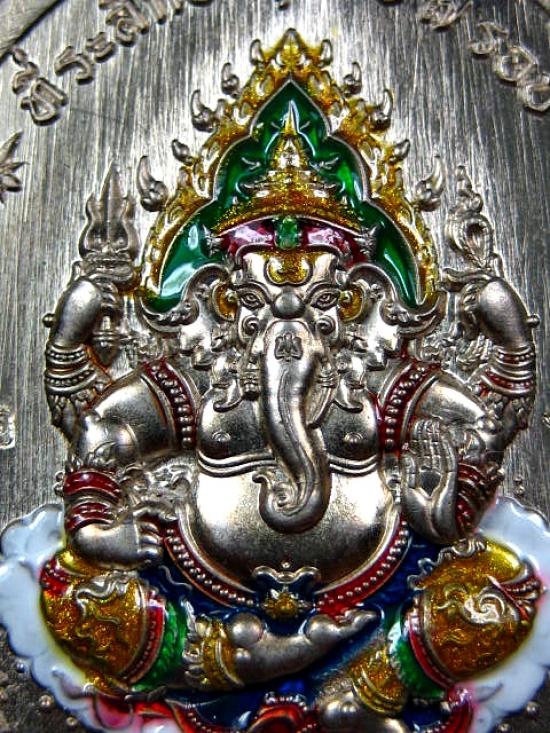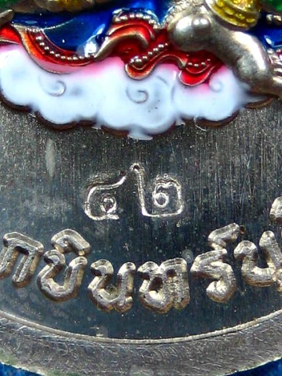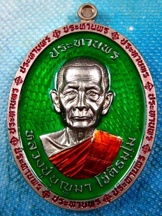 เหรียญรุ่นประทานพร เนื้ออัลปาก้าลงยาพื้นเขียว ลงยาประทานพรขอบ ลงยาจีวร หลังลงยาเครื่องทรง พระพิฆเนศ หลวงปู่บุญมา โชติธมโม สำนักสงฆ์เขาแก้วทอง (---A81---)