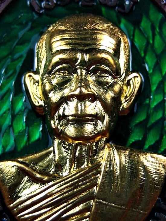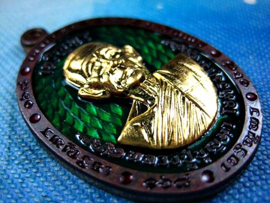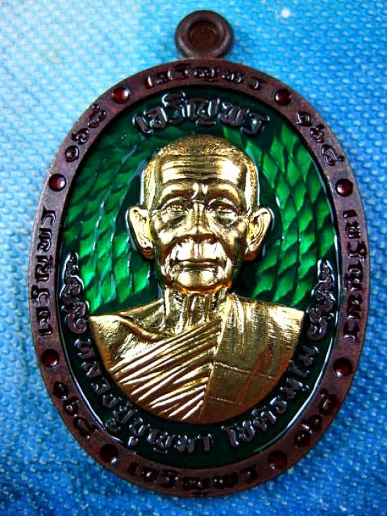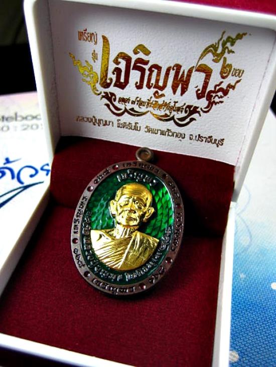 เหรียญรุ่นเจริญพร 6 รอบ เนื้อนวะโลหะลงยาสีเขียว หน้ากากทองทิพย์ กล่องกำมะหยี่ หลวงปู่บุญมา โชติธมโม สำนักสงฆ์เขาแก้วทอง (---A85---) |
