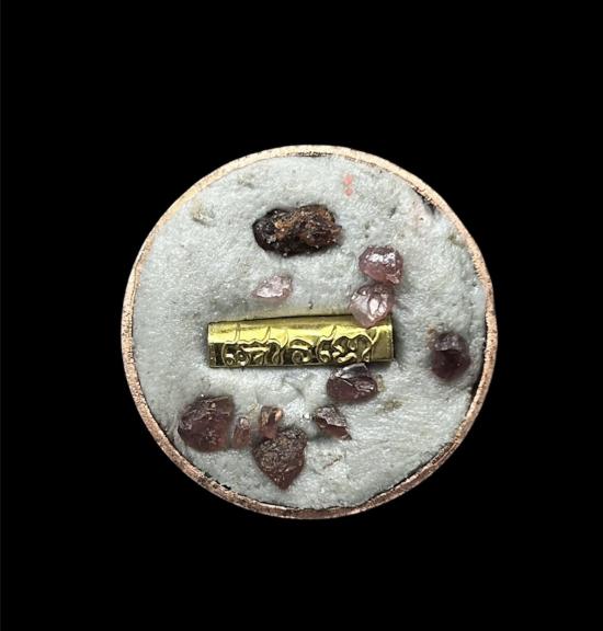 ด้านหลังอุดผงพุทธคุณ 3 องค์ครู + ตะกรุดโกวิโท + พลอยเสก