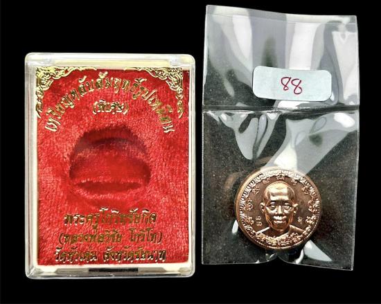 เหรียญตลับยาหม่อง หลวงพ่อวิชัย วัดหัวเด่น เนื้อสัมฤทธิ์เดช" (วรรณออกแดง) เลขมงคลรวย 88 ด้านหลังอุดมวลสารตะกรุดและพลอยเสก |