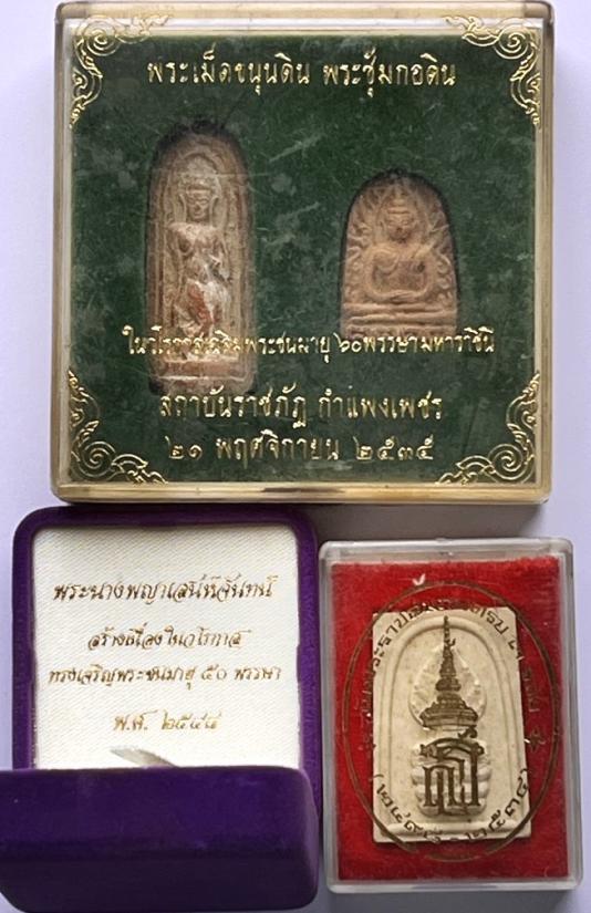 พระซุ้มกอ+ลีลาเม็ดขนุน หลัง สก60 พรรษา มหาราชินี สถาบันราชภัฏกำแพงเพชร ปี35 เนื้อดิน + นาคปรก 3รอบ สธ ปี34 เนื้อผง+นางพญาเสน่ห์จันทร์ 50 พรรษา สมเด็จพระเทพฯ ปี48 เคาะเดียว