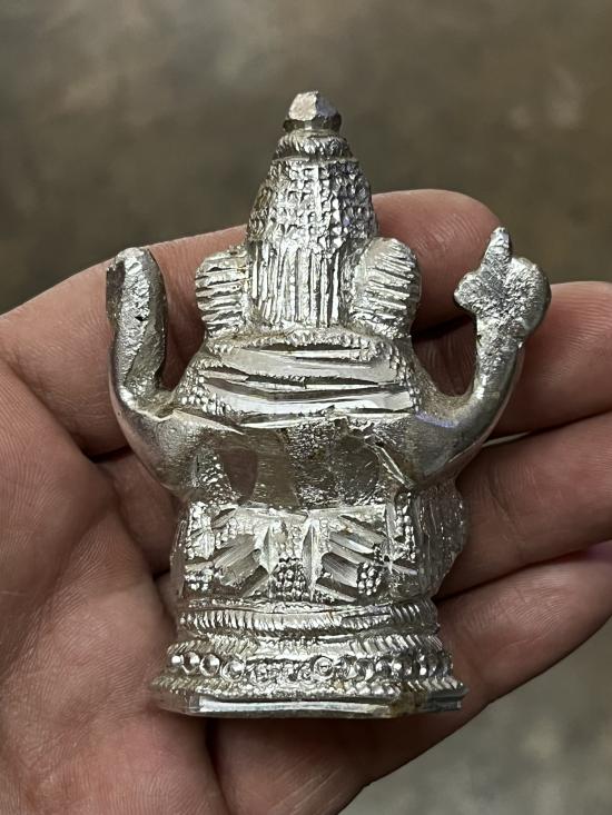 ชื่อพระเครื่อง พระบูชาพิฆเนศ หน้ากว้าง1.5นิ้วสูง3นิ้ว เนื้ออลูมิเนียม แต่งมือ ฝังพลอย ไม่ทราบที่