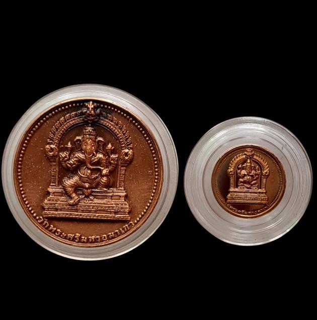เหรียญพระพิฆเนศ หลังพระแม่อุมาเทวี วัดพระศรีมหาอุมาเทวี (วัดแขกสีลม) พิมพ์ใหญ่ เนื้อทองแดงซาติน ขนาด 3 ซม เหรียญเล็ก เนื้อทองแดงปัดเงา ขนาด 1.5 ซม สวยงามมาก พร้อมตลับเดิม |