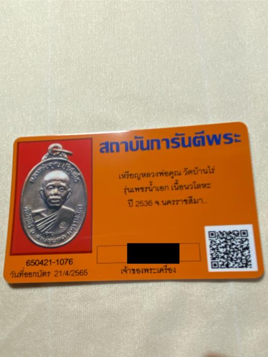 เหรียญหลวงพ่อคูณ วัดบ้านไร่ รุ่นเพชรน้ำเอก เนื้อนวโลหะ ปี2536 จ.นครราชสีมา พร้อมบัตรรับรองฯ โอนเงินแล้วแจ้งรายละเอียดการโอนทาง Mailbox ของเวปจี ได้รับแจ้งว่าโอนเงินแล้วจะส่งพระภายใน 3 วันทำการ