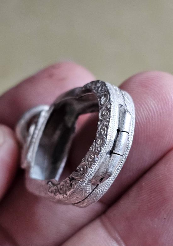 ตลับเงิน รูปเสมาเล็ก อย่างดี ยิง%เรียบร้อย 93.80% งานมือ ขนาด (1.50X1.90)Cm หรือเหรียญขนาดใกล้เคียง สวยเดิม เคยใส่พระเหรียญตามรูป ผมแกะมาล้างทำความสะอาดเบื้องต้นให้กำลังกลับดำครับ เงินแท้%สูงตามเอกสารครับ |