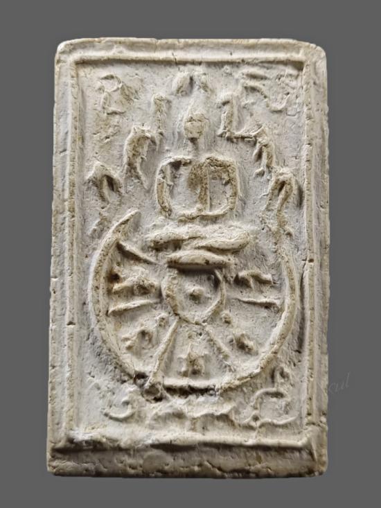 -ลักษณะเป็นพระพุทธเจ้าประทับนั่งบนกงล้อธรรมจักร มีรัสมีเปลวเพลิงอยู่ด้านหลัง ในกงล้อธรรมจักรมียันต์ตุ๊กตาอยู่ 5 ตน อันหมายถึงพระปัญจวัคคีทั้ง5 ที่หัวมุมทั้ง 4 ด้าน ลงพระคาถาหัวใจอริยสัจ4 อ่านว่า ทุ สะ นิ มะ