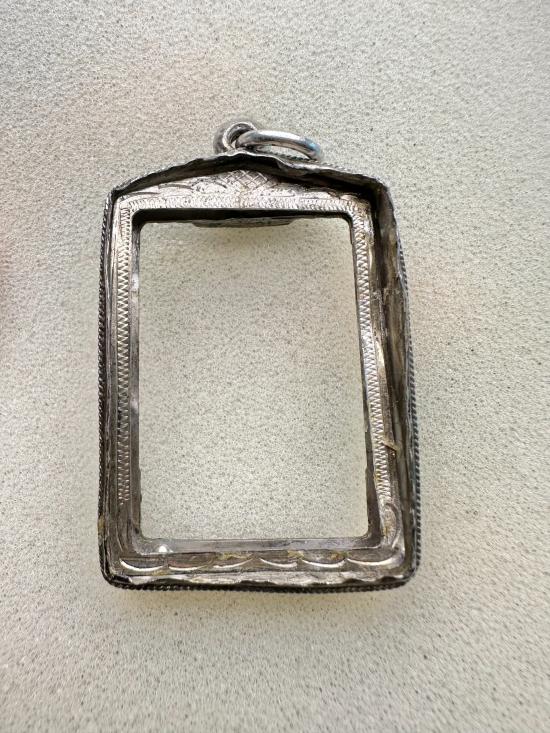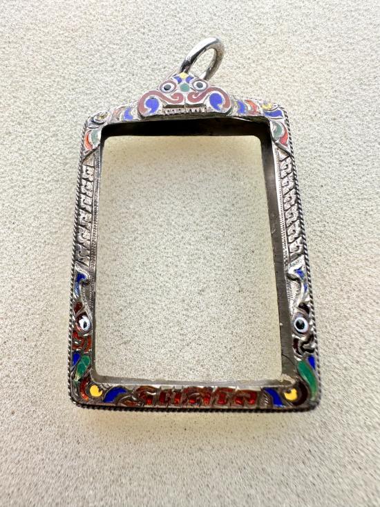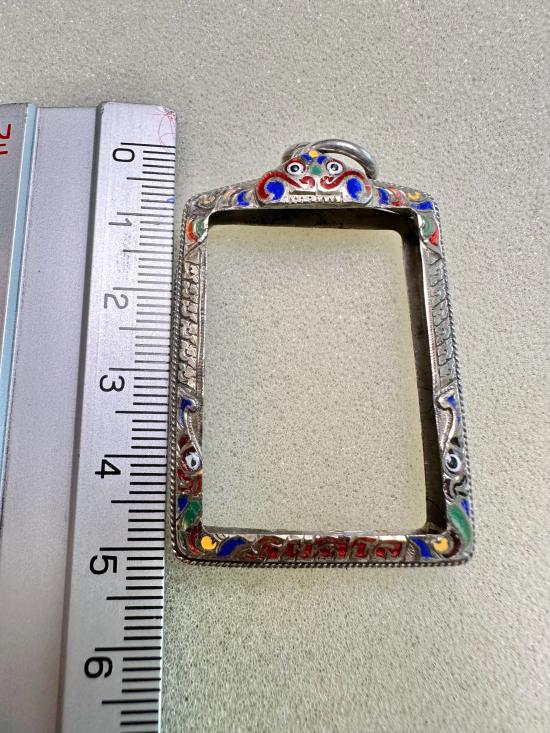 กรอบเงินแท้ลงยา สั่งทำลงยาอย่างดี ใส่นั่งตั่งหลวงปู่หมุนพอดีค่ะ น้ำหนัก 7.45 กรัม ขนาดอยู่ในรูปด้านล่างค่ะ