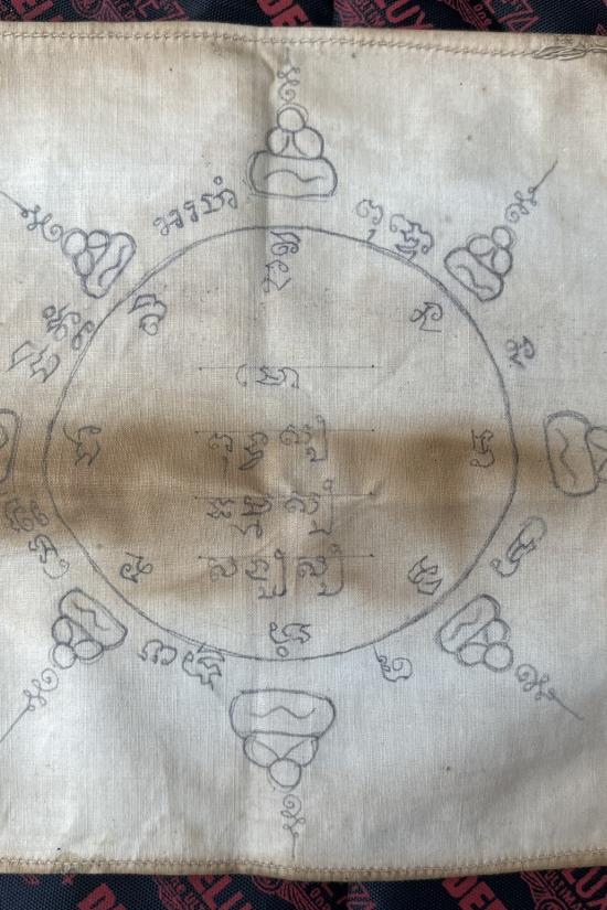 ผ้ายันต์รองหมวก หรือหัวเสาไม่เเน่ใจ จารมือ เก่าแท้ดูง่ายไม่ทราบที่ครับ |
