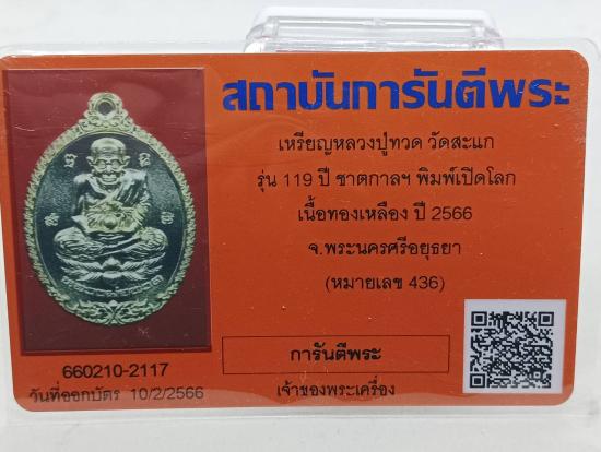 ชื่อพระเครื่อง วัดใจ@@หรียญหลวงปู่ทวดเปิดโลก ปี 2566 รุ่น 119 ชาตกาล หลวงปู่ดู่ เนื้อทองเหลือง พร้อมกล่องเดิม บัตรรับรองสบายใจ