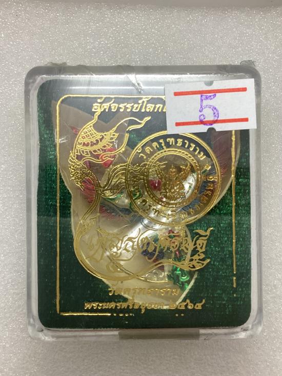 พญาครุฑทรงมหิธานุภาพ เชิญธงเศรษฐี วัดครุฑธาราม จ.พระนครศรีอยุธยา พิมพ์ใหญ่ สูง 4.5 ซ.ม. เนื้อตริยะโลหะ (สัมฤทธิ์ผล) ชุบ 2 K ลงยาราชาวดี ซีลเดิมยังไม่ได้แกะ