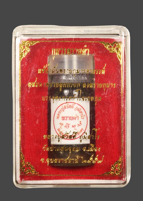 มวลสาร...แกะจากไม้ที่เหลือจากกองฟอนเผาศพเด็กจมน้ำตาย นำมาทำพิธีล้างเสนียดจัญไร ให้เหลือแต่คุณ จากนั้นแช่น้ำมันพรายกุมารอาถรรย์ น้ำมันจันทคราส อาจารย์เปล่ง บุญยืน ผสมผงลูกกรอกพรายดำ ผงพรายกุมาร ผงเถ้าเชิงตะกอน ขี้ผึ้งหน้าผี บรรจุตะกรุดหัวใจเจตภูติ(พรายกระซิบ) อุดด้วยผงอาถรรย์ที่ฝาจุก