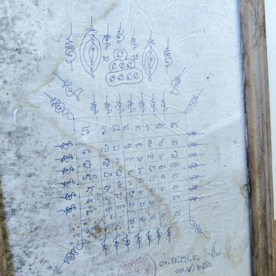 ผ้ายันต์จารมือเก่าเก็บ วัดโฆสิตาราม ด้านหลังใบกำหนดการฉลองสมณศักดิ์ หลวงพ่อกวย วัดใจ