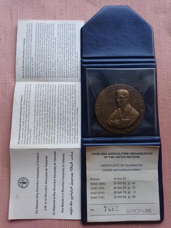 รายละเอียด เหรียญ Agricola F.A.O ในหลวงร.9 ที่ระลึกสดุดีพระเกียรติคุณ ((( เนื้อบรอนซ์ ขนาด 5 ซม. ))) เก่าเก็บ ไม่ผ่านใช้ เดิมๆ มีซองเดิม+ใบ