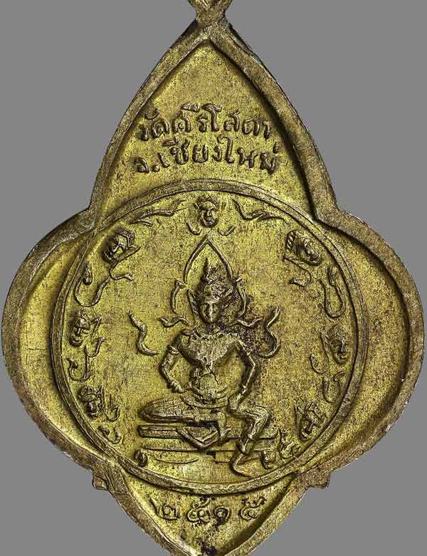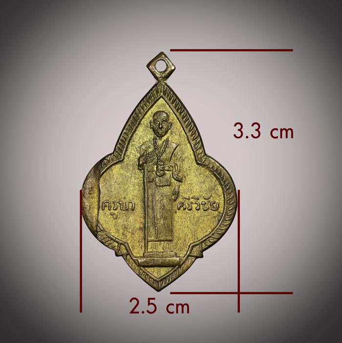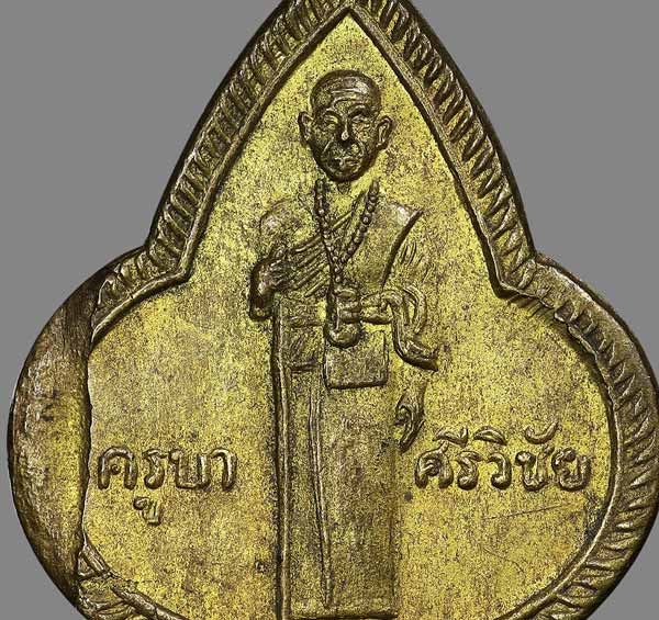 เหรียญทรงดอกจิกครูบาศรีวิชัย ลักษณะของครูบาฯ ยืนถือไม้เท้า ส่วนด้านหลังเหรียญเป็นรูปพระสยามเทวาธิราช วัดศรีโสดา จ.เชียงใหม่ สร้างปี 2515 เนื้อทองฝาบาตร |