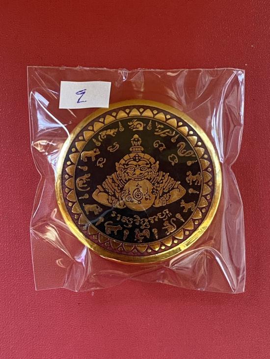 เคาะเดียวแดง สีผึ้งพระราหู รุ่น มงคลจักรวาล เนื้อ โลหะชุบทองลงยาสีดำขอบสีแดง ขนาด5ซม |
