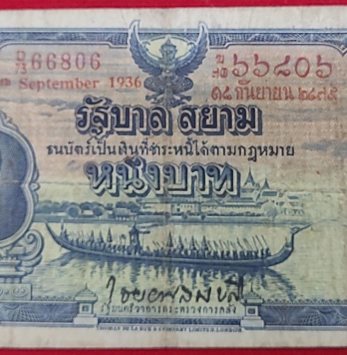 ธนบัตร 1บาท โทมัส ร.8 เลขแดง พ.ศ. 2479 ลายเซ็น พระยาไชยยศสมบัติ |