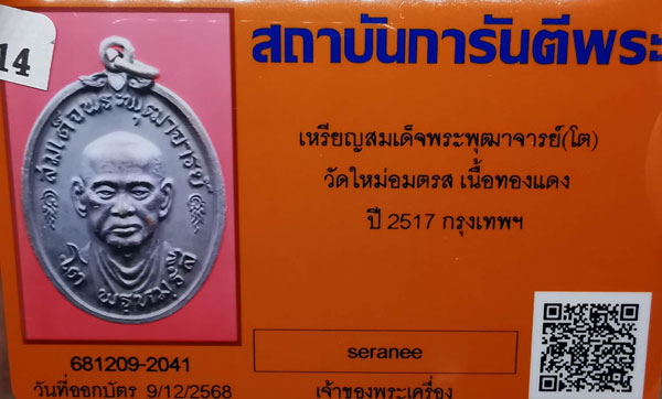 เหรียญสมเด็จพระพุฒาจารย์(โต) วัดใหม่อมตรส เนื้อทองแดง ห่วงเดิม ปี2517 จ.กรุงเทพ + กล่องเดิม + บัตรG-pra สภาพสวยเดิมค่ะ |