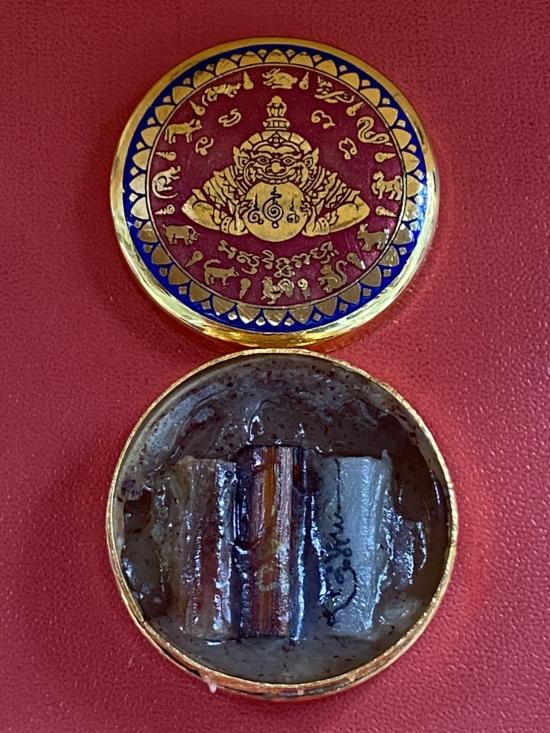 เคาะเดียวแดง สีผึ้งพระราหู รุ่น มงคลจักรวาล เนื้อ โลหะชุบทองลงยาสีแดงขอบสีน้ำเงิน ขนาด3.2ซม |
