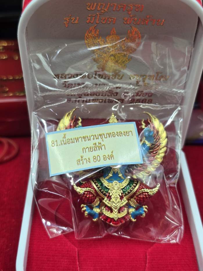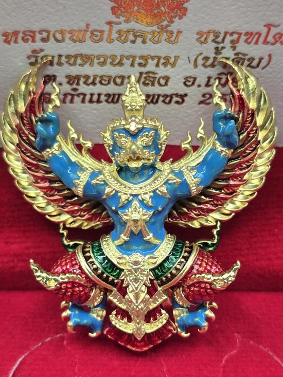 พญาครุฑ รุ่นมีโชคพันล้าน หลวงพ่อโชคชัย วัดน้ำดิบ เนื้อมหาชนวนชุบทองลงยากายฟ้า สร้าง 80 องค์ หมายเลข ๕๖ พร้อมกล่องเดิม |
