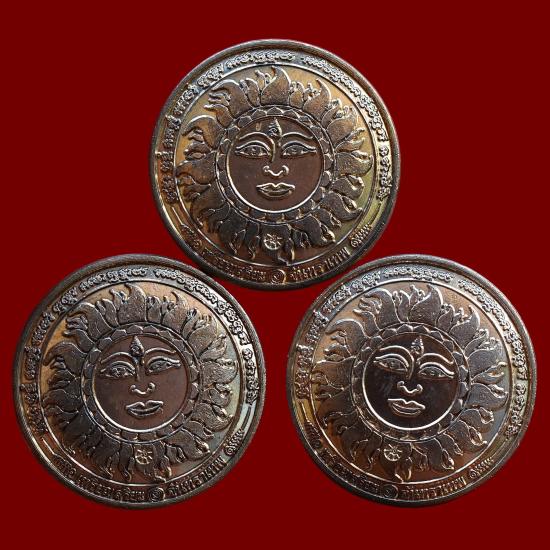 ชุด 3 องค์...เหรียญสุริยันต์ จันทราเทพ เนื้ออัลปาก้า ปี 2556 หลวงปู่สิงห์ วัดบ้านป่าตะแบง จ.นครราชสีมา พร้อมซองรูปเดิมจากวัด สภาพพระตามรูปที่ลงทุกประการ (ขนาดประมาณ 3.1 ซม.)