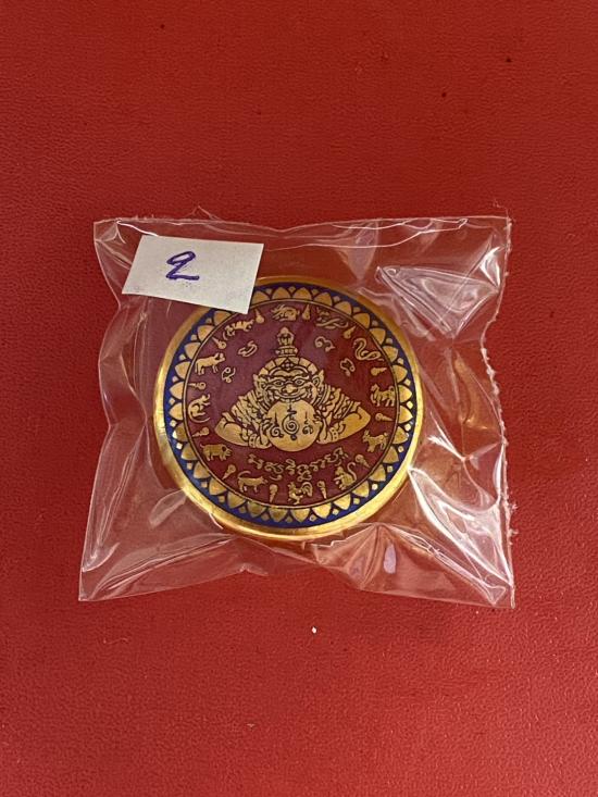 เคาะเดียวแดง สีผึ้งพระราหู รุ่น มงคลจักรวาล เนื้อ โลหะชุบทองลงยาสีแดงขอบสีน้ำเงิน ขนาด3.2ซม