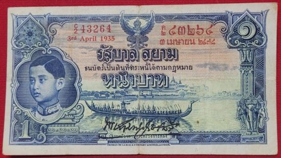 ธนบัตร 1บาท โทมัส รัชกาลที่ 8 เลขแดง หมายเลข 2C 43264-๒ค ๔๓๒๖๔ ลายเซ็น พระยามานวราชเสวี พิมพ์เมื่อ วันที่ 3 เมษายน 2478 ที่บริษัท โทมัส เดอ ลารู แอนด์ คัมปานี ลิมิเตด,ลอนดอน |