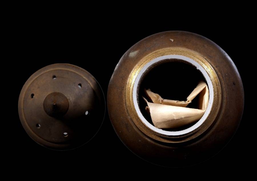 อูบทองเหลืองเก่า ภายในมีเม็ดคล้ายพระธาตุสีแดงชมพู สูง 2 นิ้วครึ่ง |